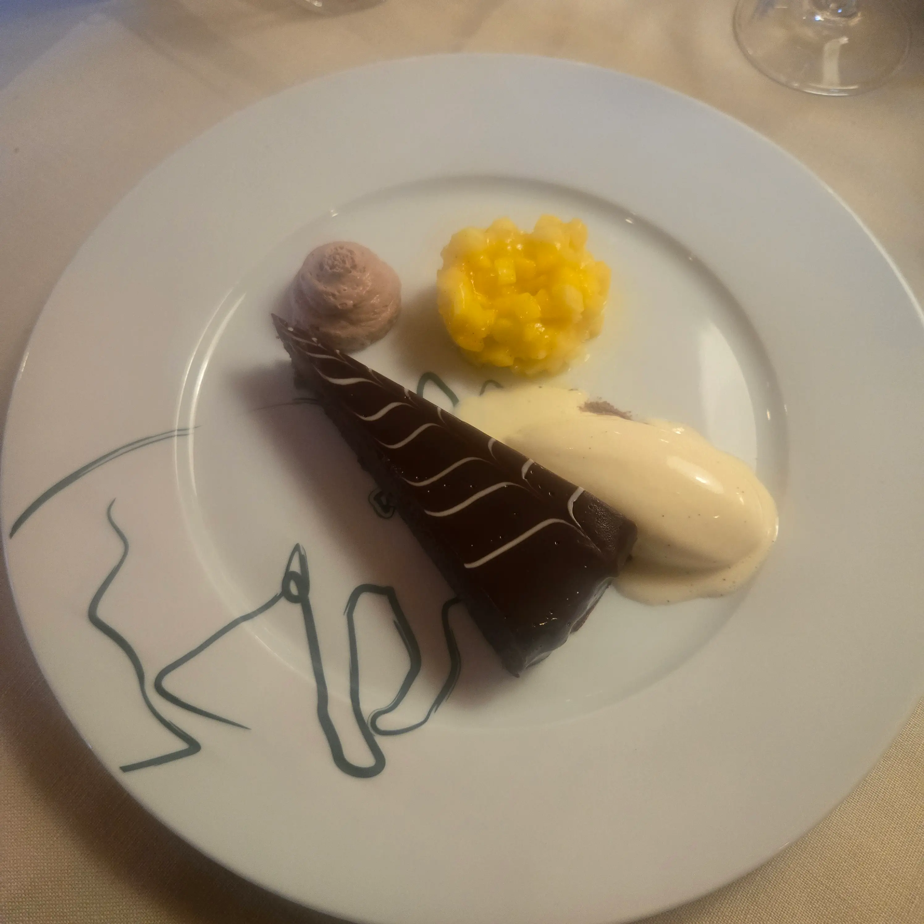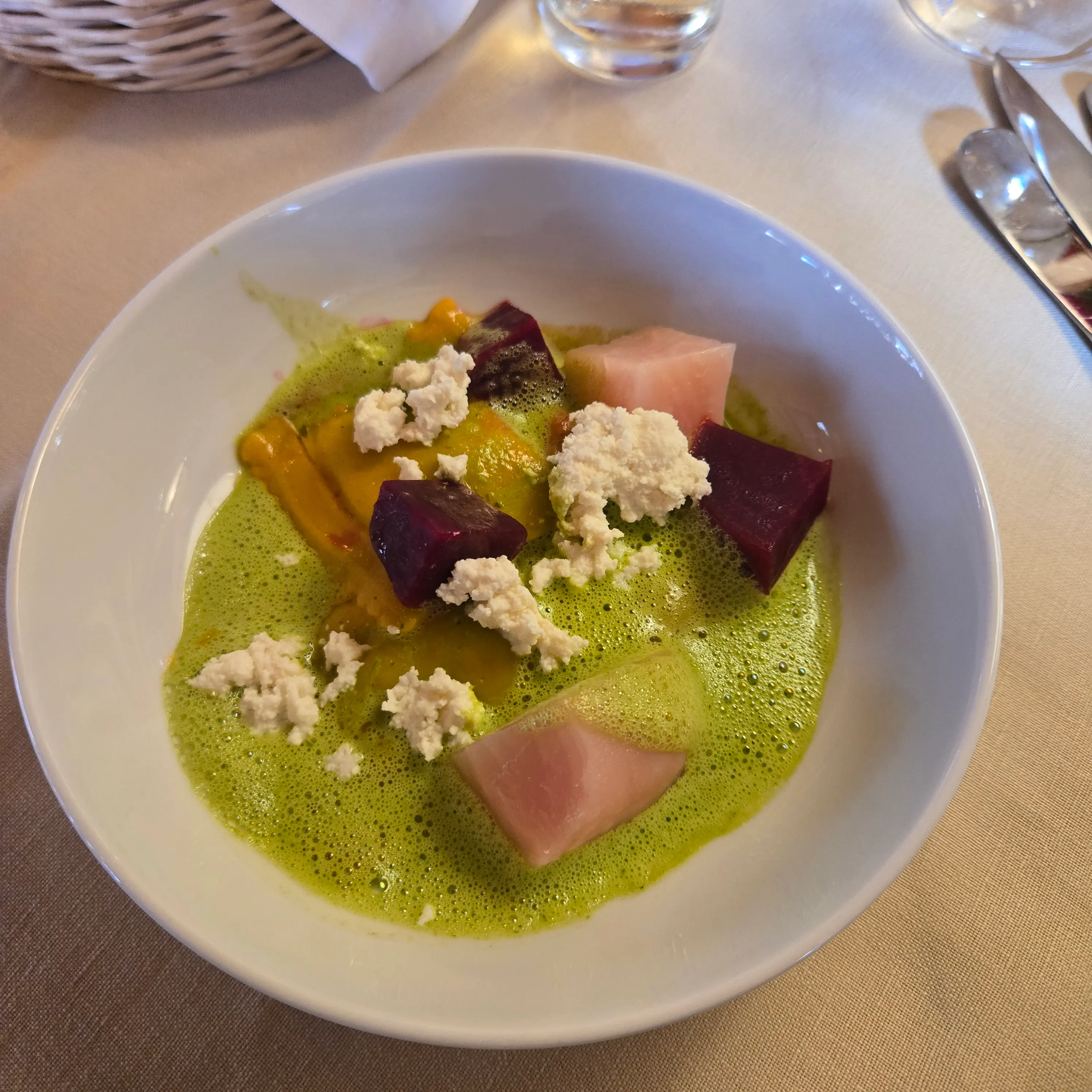 Unsere Gruppe hatte die Wahl aus einer sorgfältig zusammengestellten Abendkarte, die kreative und raffinierte Gerichte bot. Der "Kleine Gruß aus der Küche" begann mit einem köstlichen Zander auf der Haut gebraten, begleitet von kleinen Spinattortellini und Beurre Blanc oder hausgemachten Ricotta-Ravioli mit buntem Beetgemüse und Wildkräuterschaum. Als Hauptgang konnte man sich für die confierte Entenkeule mit Kartoffelknödeln, Rotkraut, Maronen und Entenjus entscheiden, oder die Münsterländer Rehnüssle aus der Keule, serviert mit hausgemachten Spätzle vom Brett, winterlichem Gemüse und Lindenbrunnenhof- und Preiselbeeren-Pfefferjus. Zum Abschluss wurde eine verführerische Schokoladentarte "Bertrand" mit Passionsfruchtsorbet und Mangoduxelle angeboten – ein perfektes Menü, das den lokalen Charakter und die kreative Kochkunst des Hauses vereinte.
